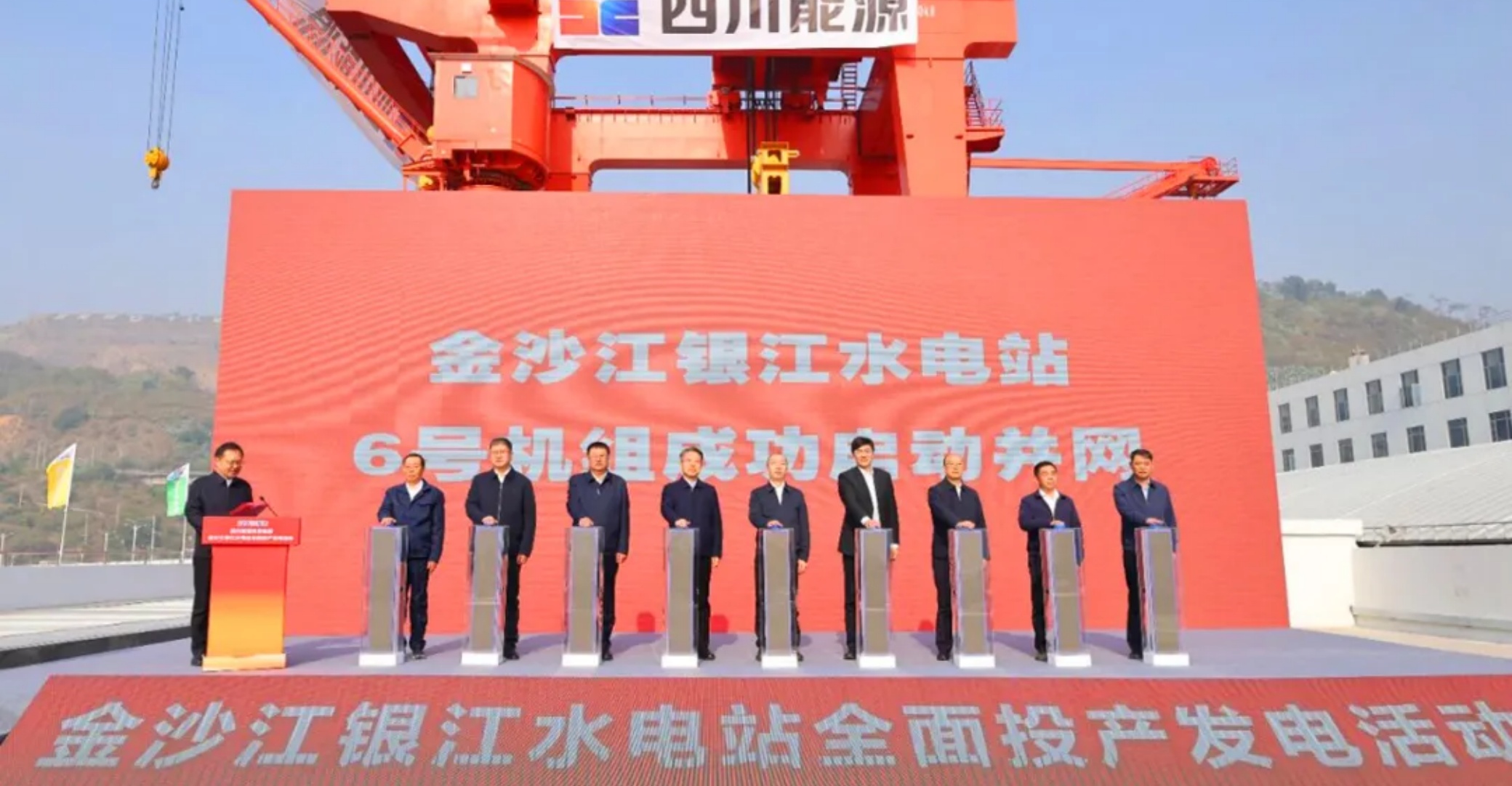 该电站由四川能源发展集团建设,是推动四川水电装机总容量历史性突破1亿千瓦的关键工程之一,进一步巩固了四川作为国家清洁能源枢纽的地位。在金沙江银江水电站大坝上,现场气氛热烈。随着发电指令下达,哈电集团研制的银江水电站最后一台(6号)机组顺利并网,电流源源不断跃动汇入电网,银江水电站正式迈入全面运营的崭新阶段。哈电集团党委常委、副总经理张连彬参加活动,现场见证这一历史时刻。